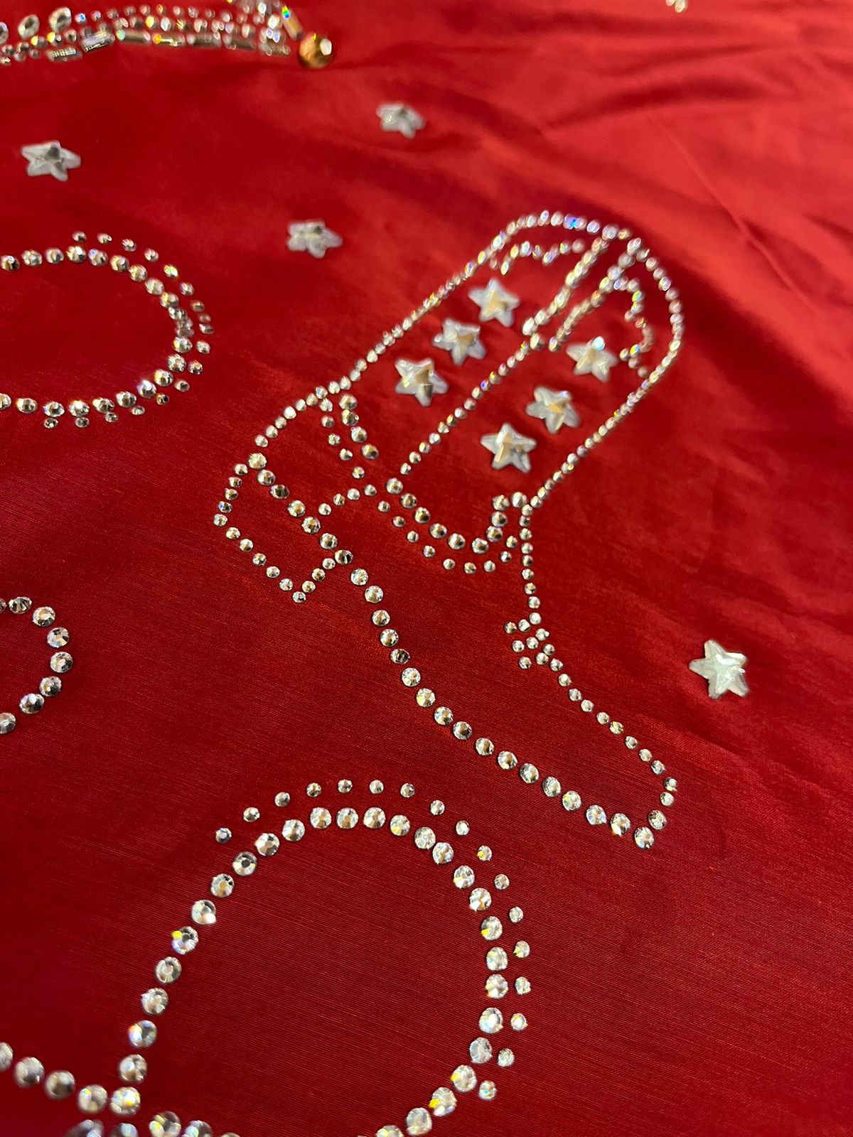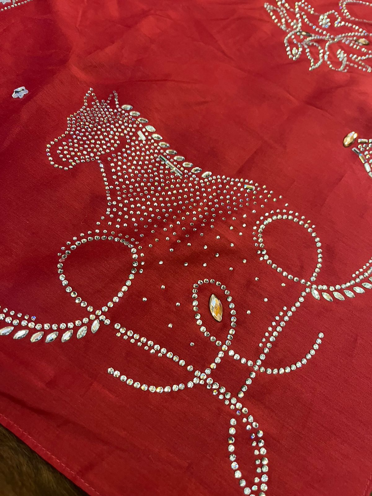 Descubra a elegância e sofisticação do nosso lenço em tecido misto de seda na cor vermelha, adornado com uma estampa deslumbrante em cristais de sobretom. Ideal para quem busca um acessório que eleve qualquer look com glamour e sutileza.
