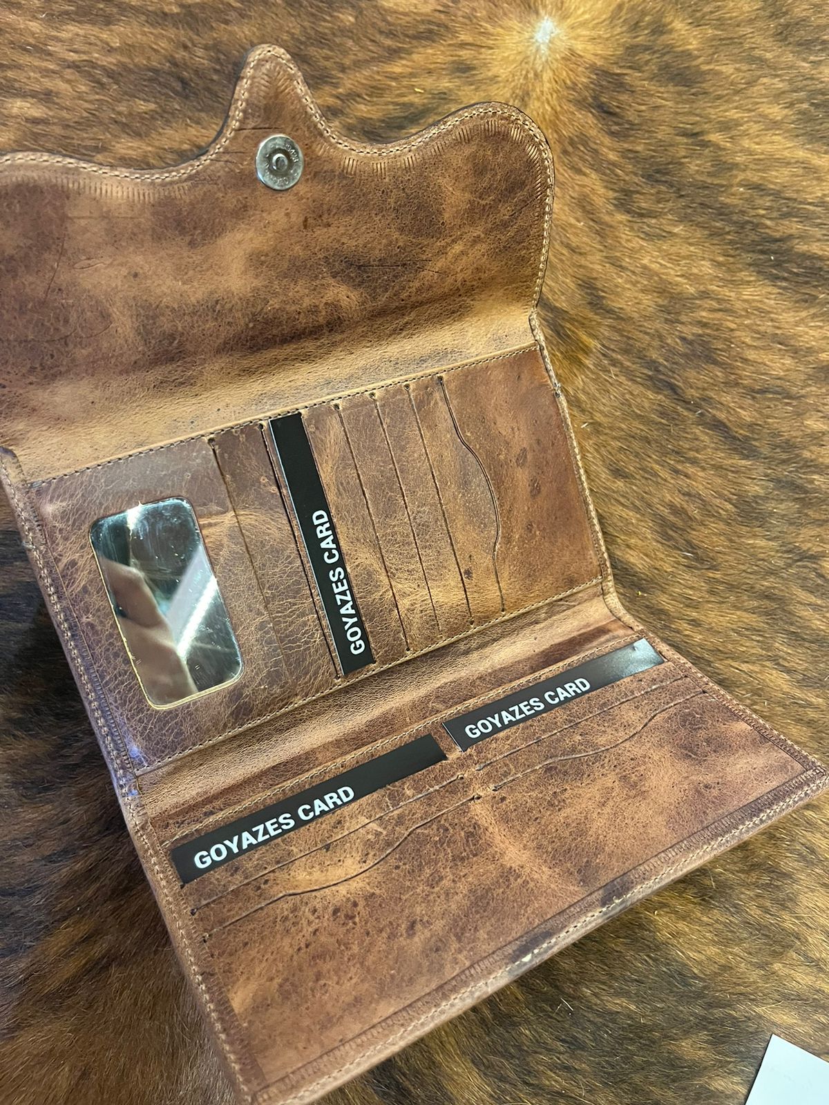 – Parte interna forrada; possui 16 divisórias para cartão/documento, 1 bolsinho porta moedas, 2 aberturas maiores para dinheiro;