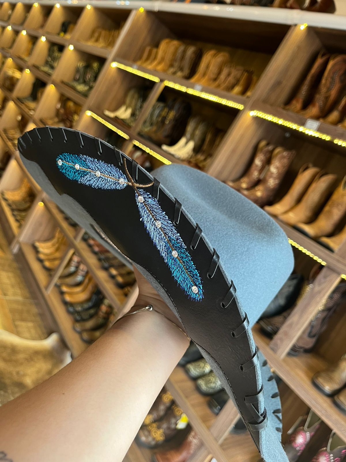 -Detalhe de couro nas abas laterais, com bordado e aplicação de pedras
