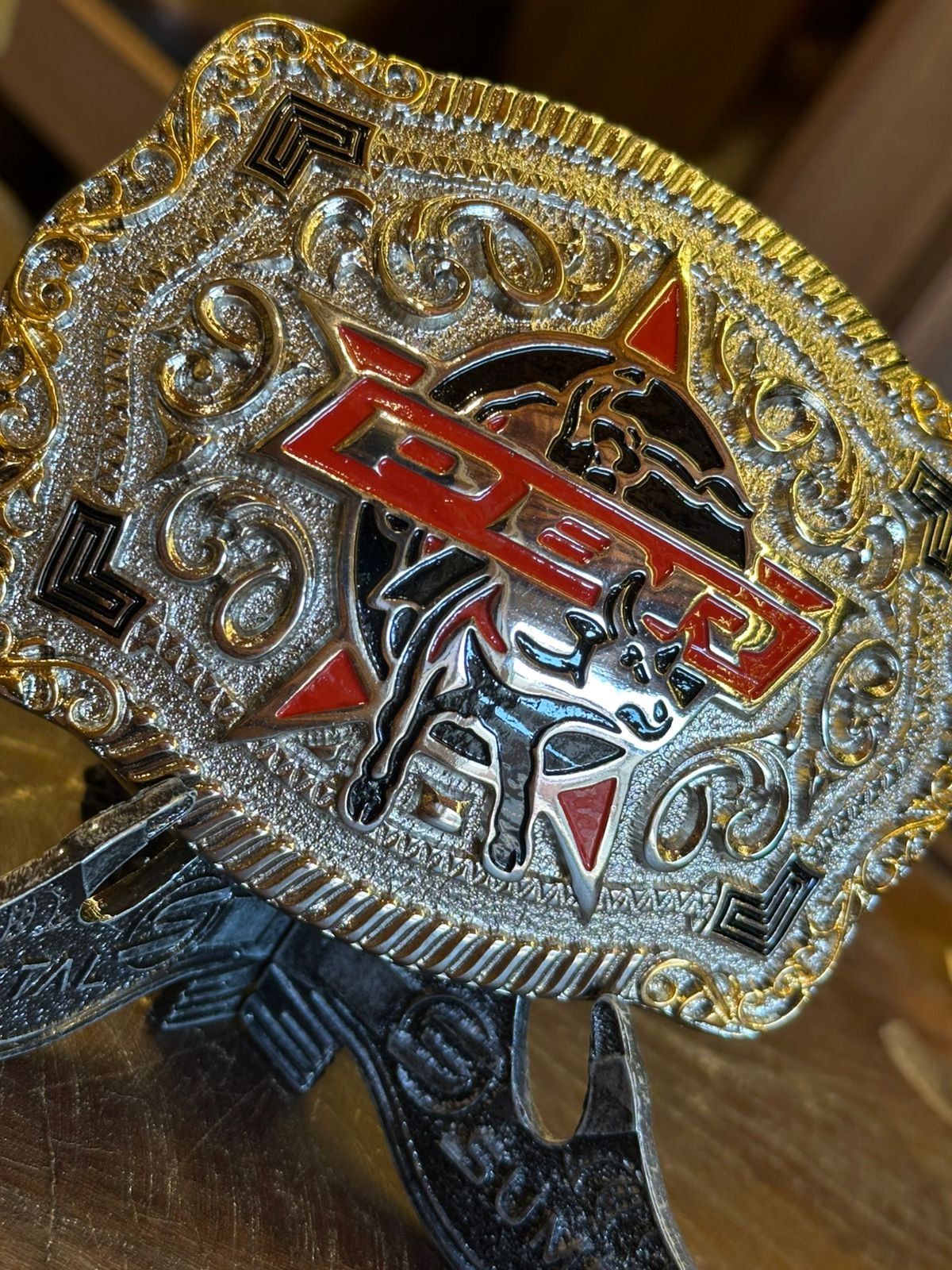 Fivela Country Sumetal, modelo oficial PBR fabricada em Zamac com Banho Prata e Ouro. Possui lindos detalhes em dourado nas bordas laterais e quatro detalhes em preto nas quatro extremidades da fivela. Com Proteção. Fixação: Pino Fixo.