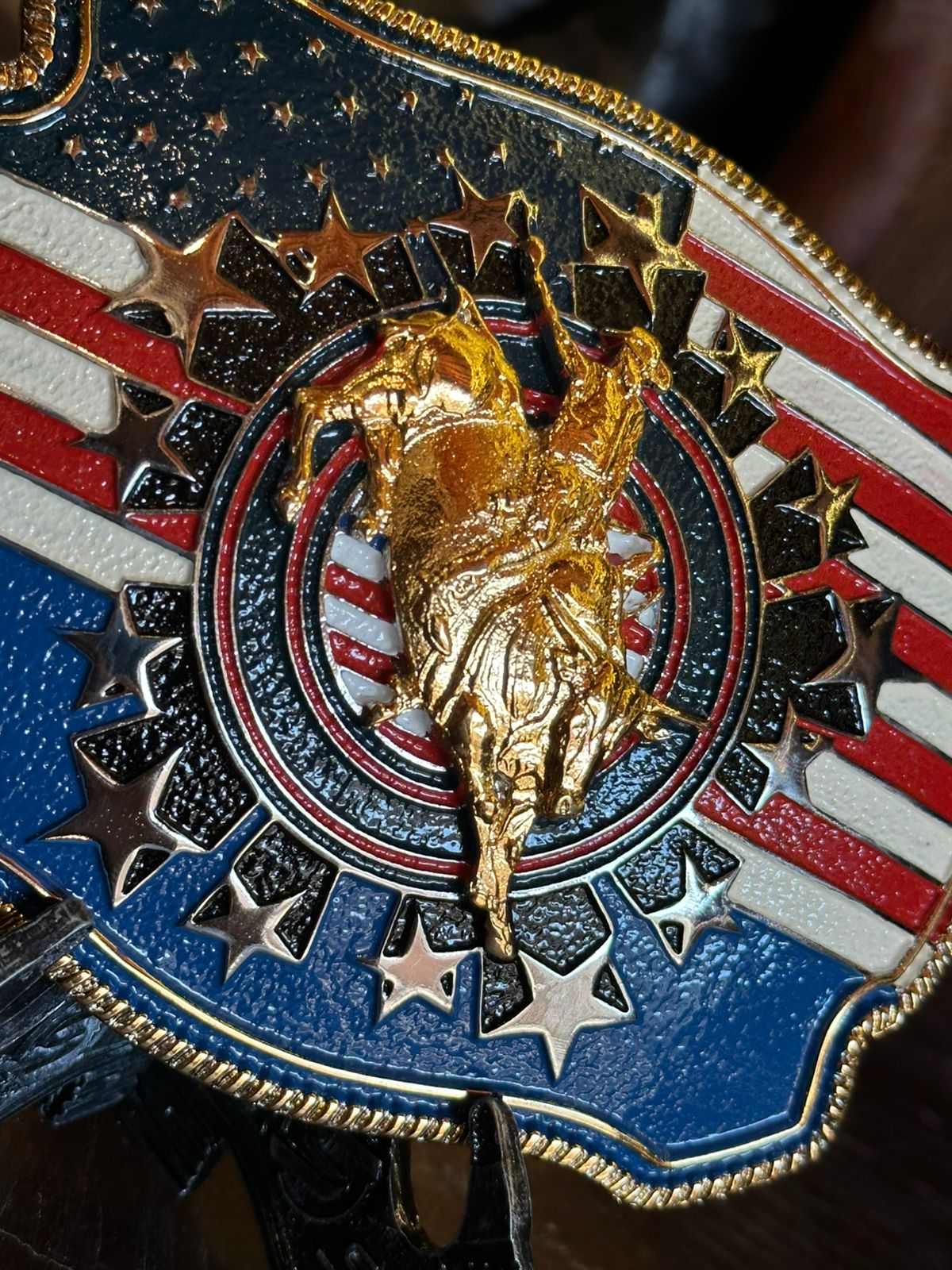 Fivela Country Sumetal, modelo Touro U.S.A fabricada em Zamac com Banho Prata e Ouro, fundo com a bandeira dos EUA e lindos detalhes das estrelas ao centro que dão todo o charme e destaque na fivela.