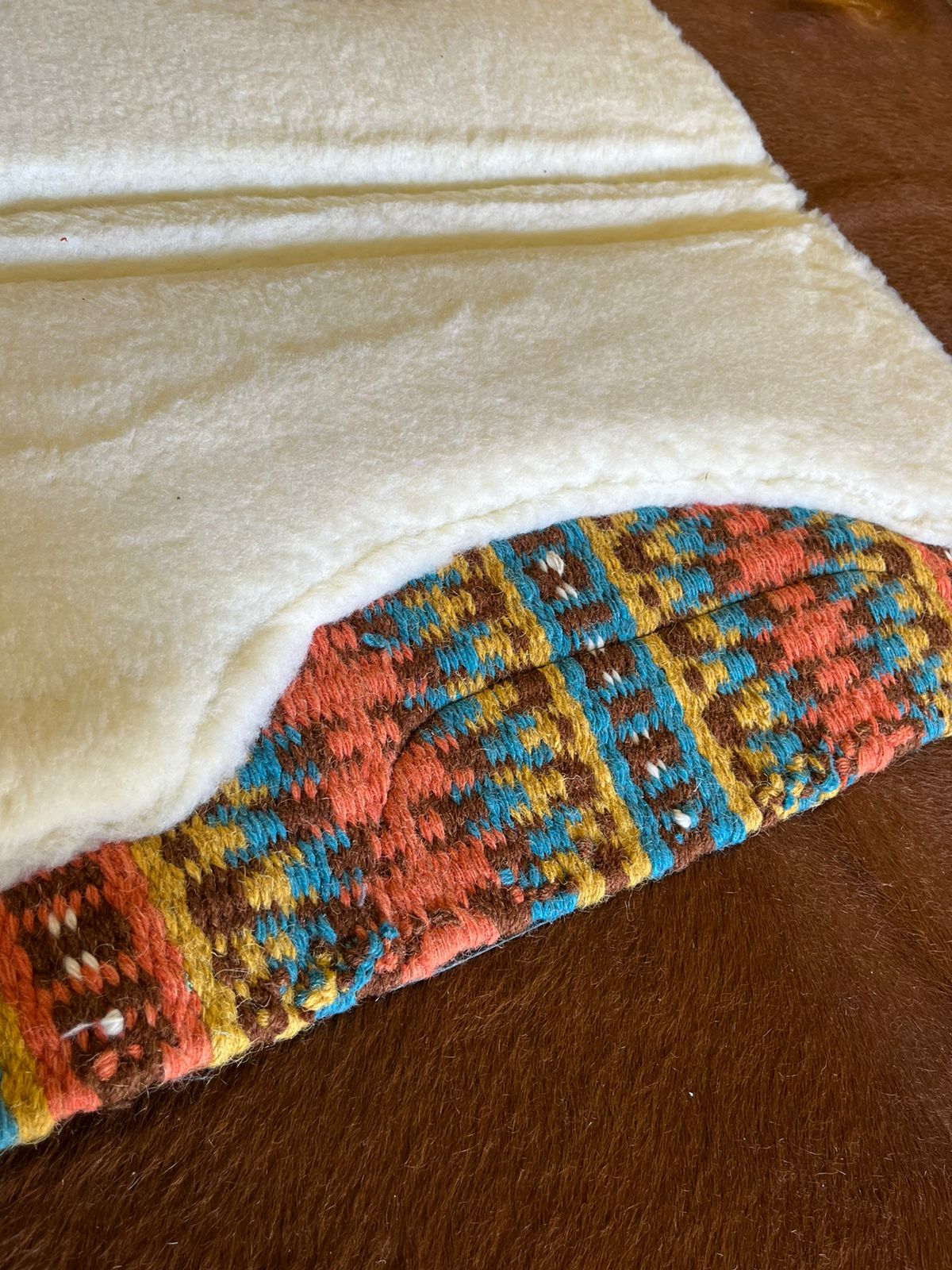 Manta fabricada em algodão trançado na parte externa com estampa navajo, com reforça em material sintético nas laterais, possui enchimento interno em pelúcia .