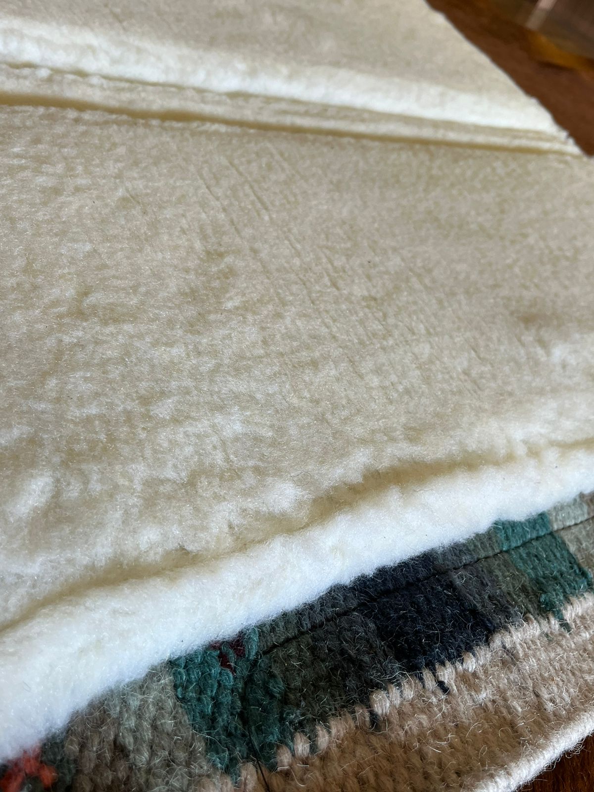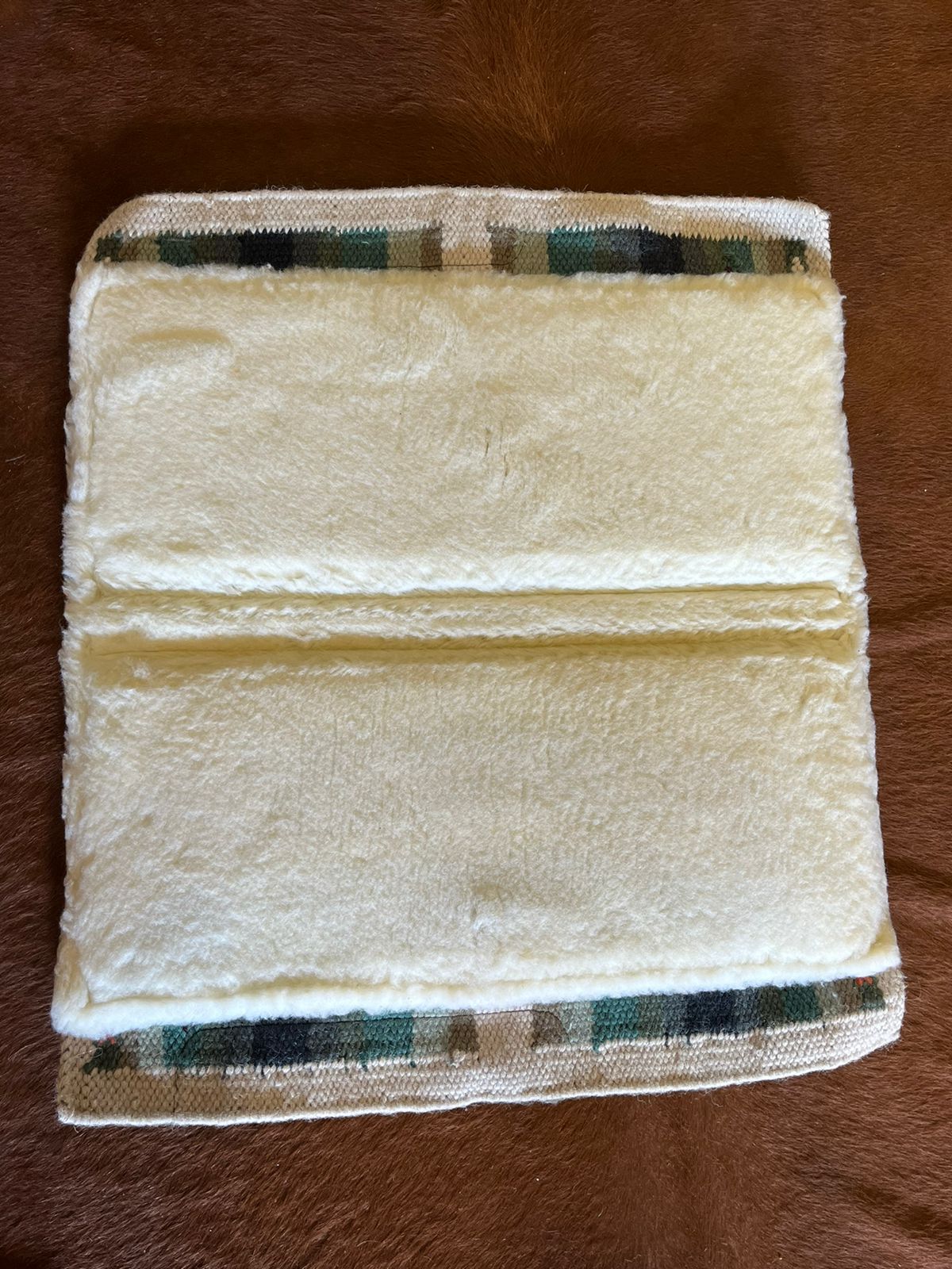 Manta fabricada em algodão trançado na parte externa com estampa navajo, com reforça em material sintético nas laterais, possui enchimento interno em pelúcia .