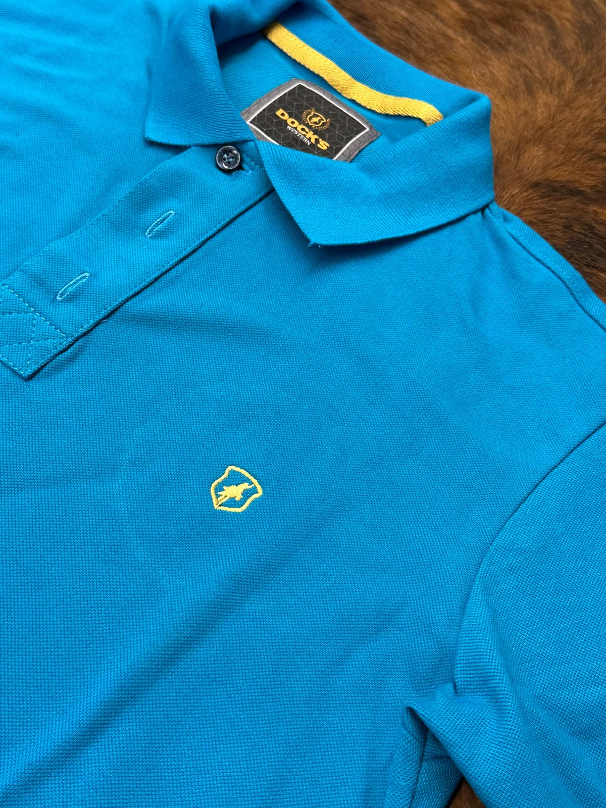 Construção: 100% algodão, gola polo com fechamento por botões tradicionais, logo Dock´s bordado em amarelo.